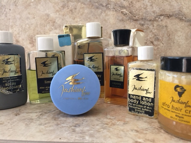 I got my inspiration from my dad, who created Fashion Line Cosmetics in Guyana in the 1970's. Left: Products from Fashion Line Cosmetics, manufactured in "The Factory," Georgetown, Guyana, circa 1972. The blue jar is a double-walled jar. All of the products have foil paper labels except the Afro Hair Creme, which has a plain paper label, and the blue jar, which has a heat stamped label imprint.